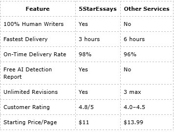 Compared to other services, 5StarEssays consistently delivers high-quality, human-written content, unlimited revisions, and verified reviews. This combination makes it a safer, more reliable choice for students who cannot afford errors or delays.